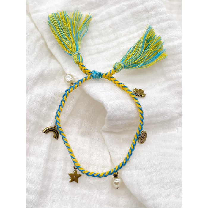 Handmade geluksarmband Dori, geweven katoen met kwastjes
